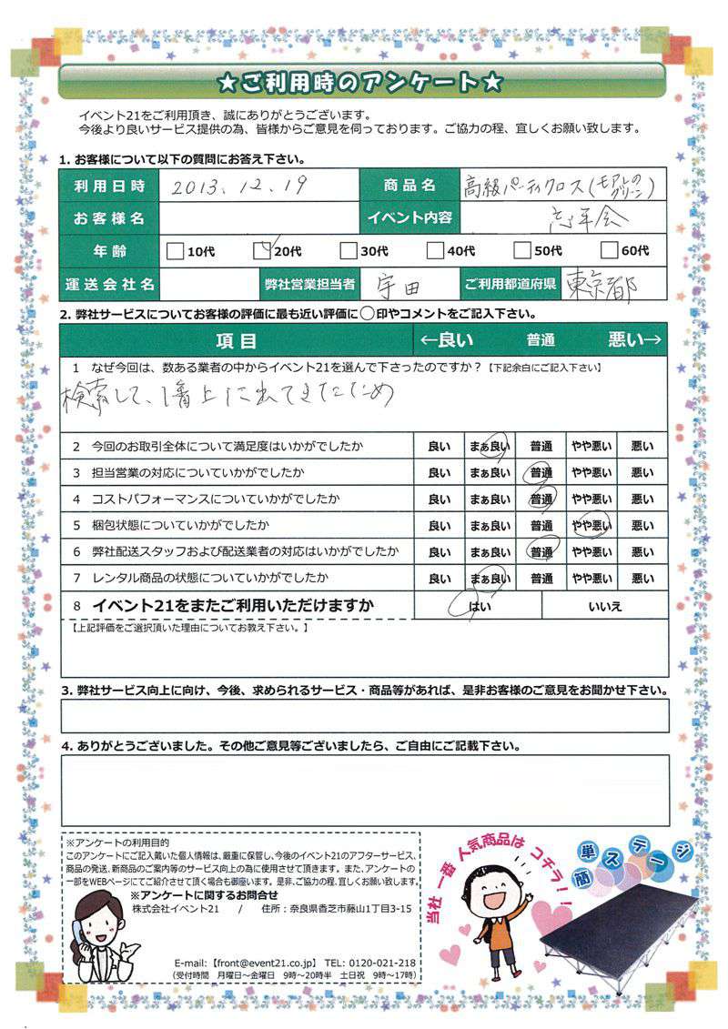 2013年12月にご利用いただいた20代、東京都のお客様より。