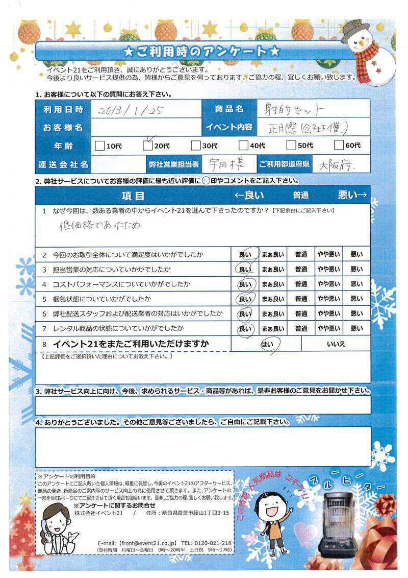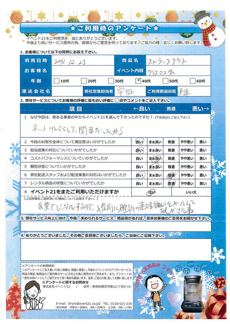 昨年に引き続き、弊社をご利用いただき、ありがとうございました。 来年も、またお声掛けいただければ大変うれしいです。 今後とも、よろしくお願いいたします。