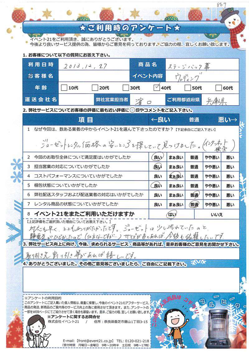 2013年12月にご利用いただいた40代、兵庫県のお客様より。