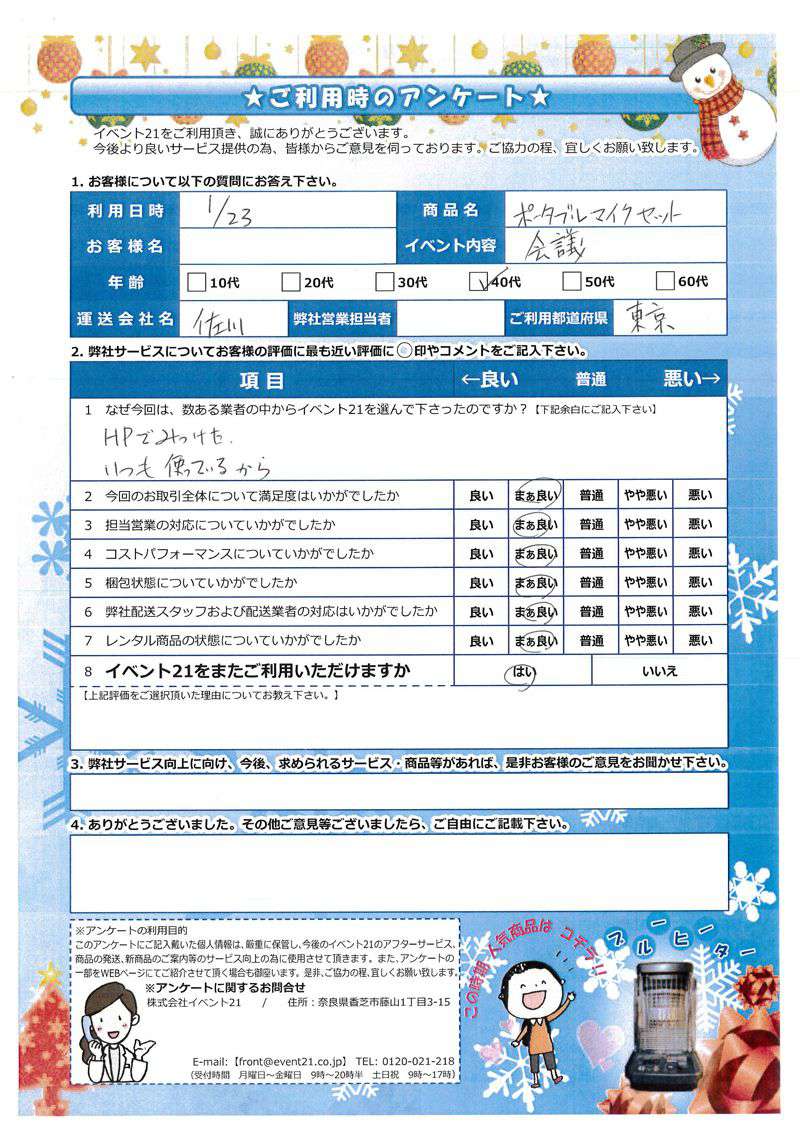 - ワイヤレスマイクを使用したイベントは初めてでしたが、大きな問題なく終了することができました。 ありがとうございました。
