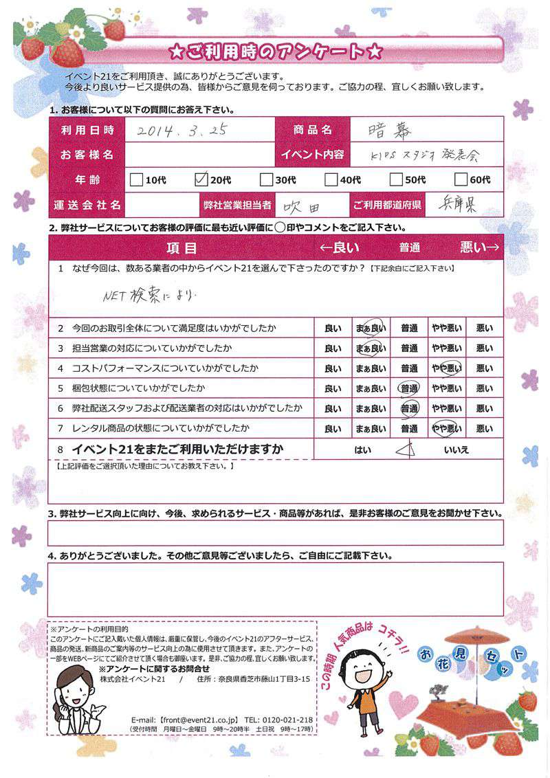 <株式会社イベント21> 本社:奈良県香芝市藤山1-3-15 配送センター:奈良県葛城市竹内811 TEL / 0745-77-6882 FAX / 0745-77-6981 front@event21.co.jp