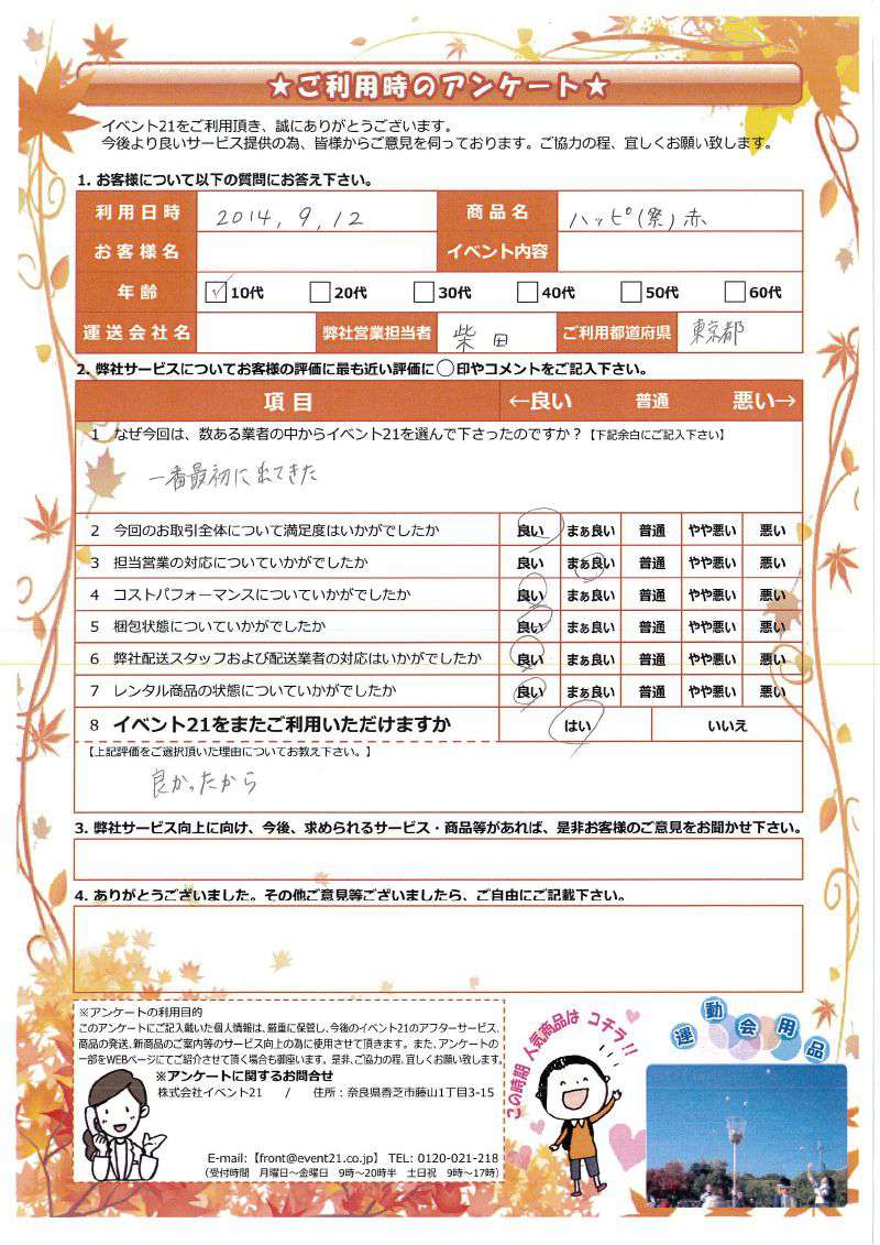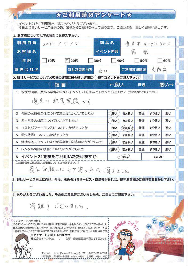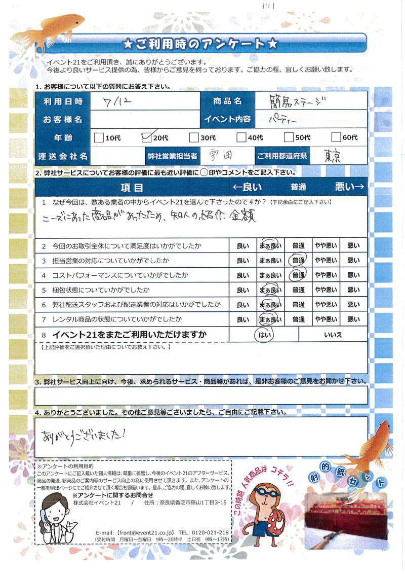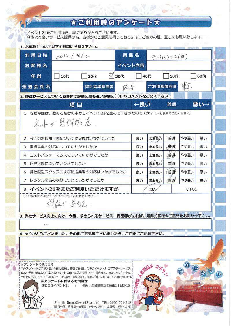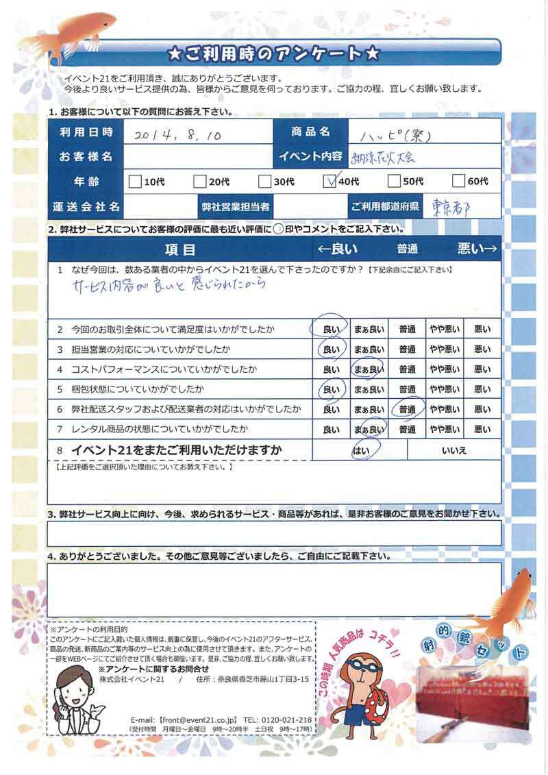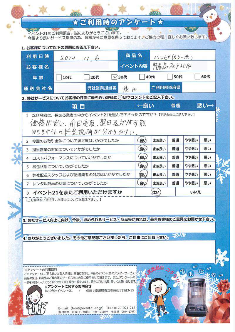 この度は弊社をご利用いただき、ありがとうございました。 イベントは急に物品が必要になることも多くあるかと思います。 可能な限り、ご対応できるように、今後も努力してまいりたいと思います。 今後ともよろしくお願いいたします。