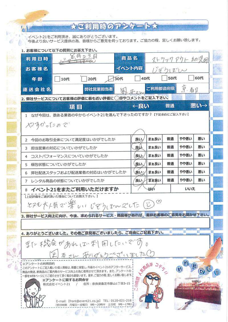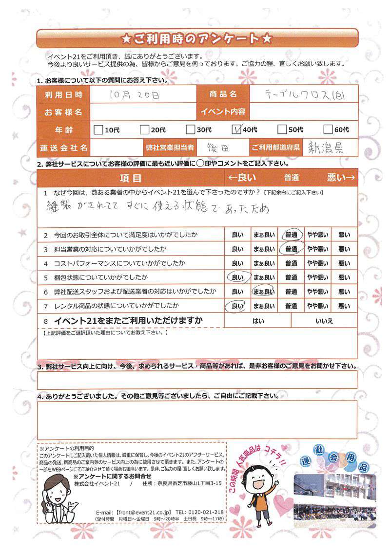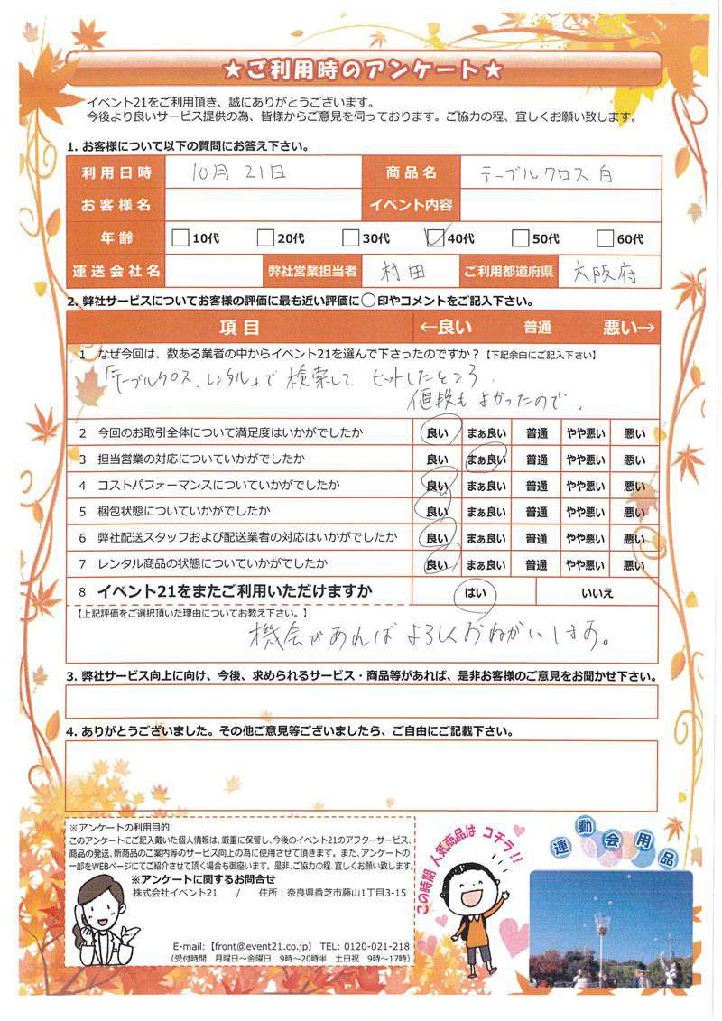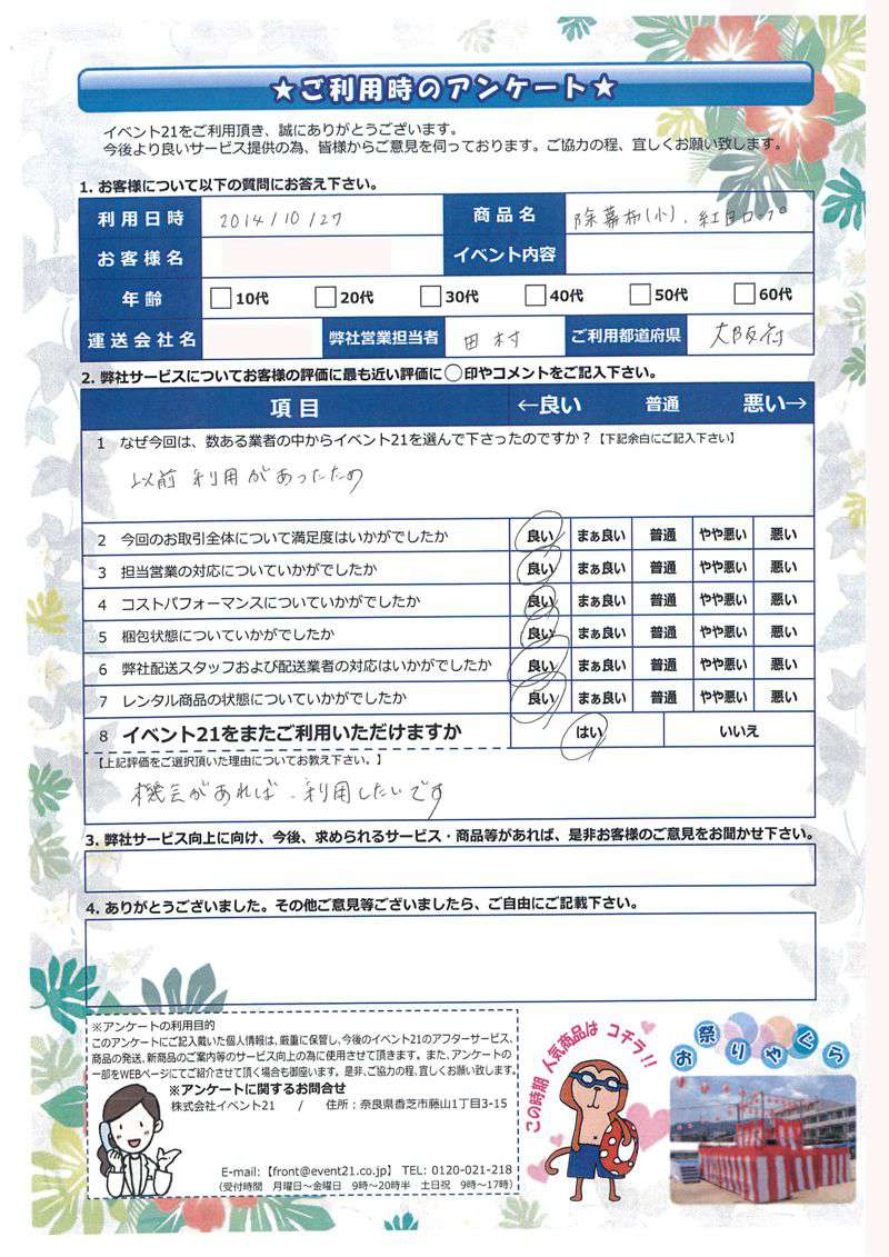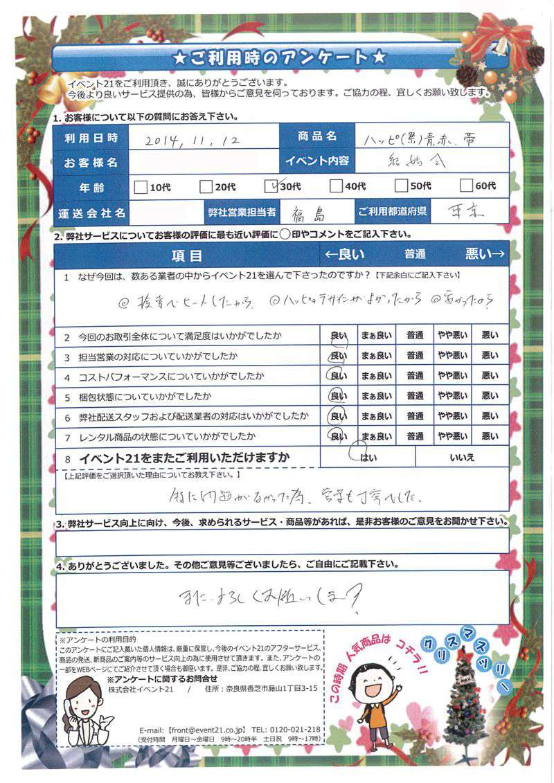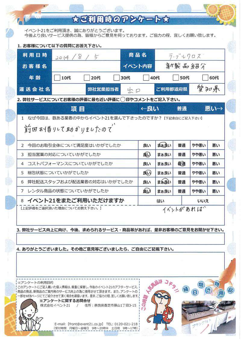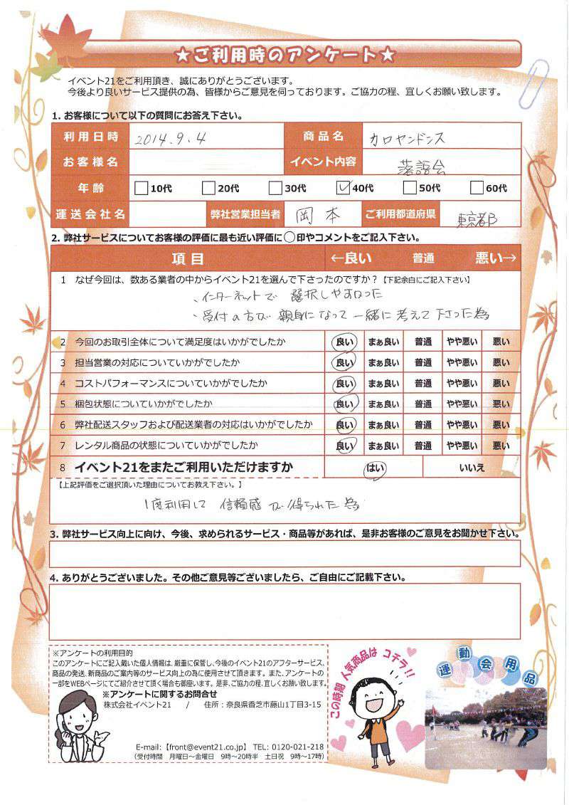 この度は弊社をご利用いただき、ありがとうございました。 イベントは急に物品が必要になることも多くあるかと思います。 可能な限り、ご対応できるように、今後も努力してまいりたいと思います。 今後ともよろしくお願いいたします。