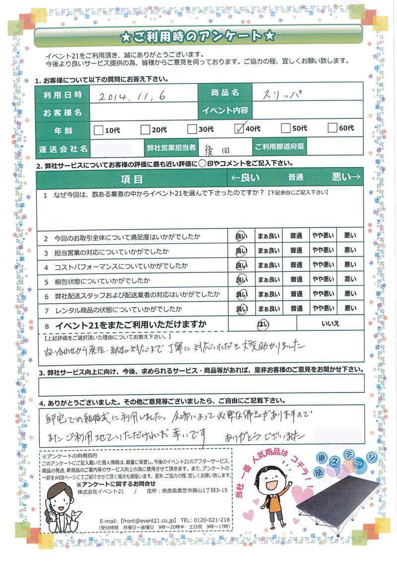 2014年11月にご利用いただいた40代、奈良県のお客様より。