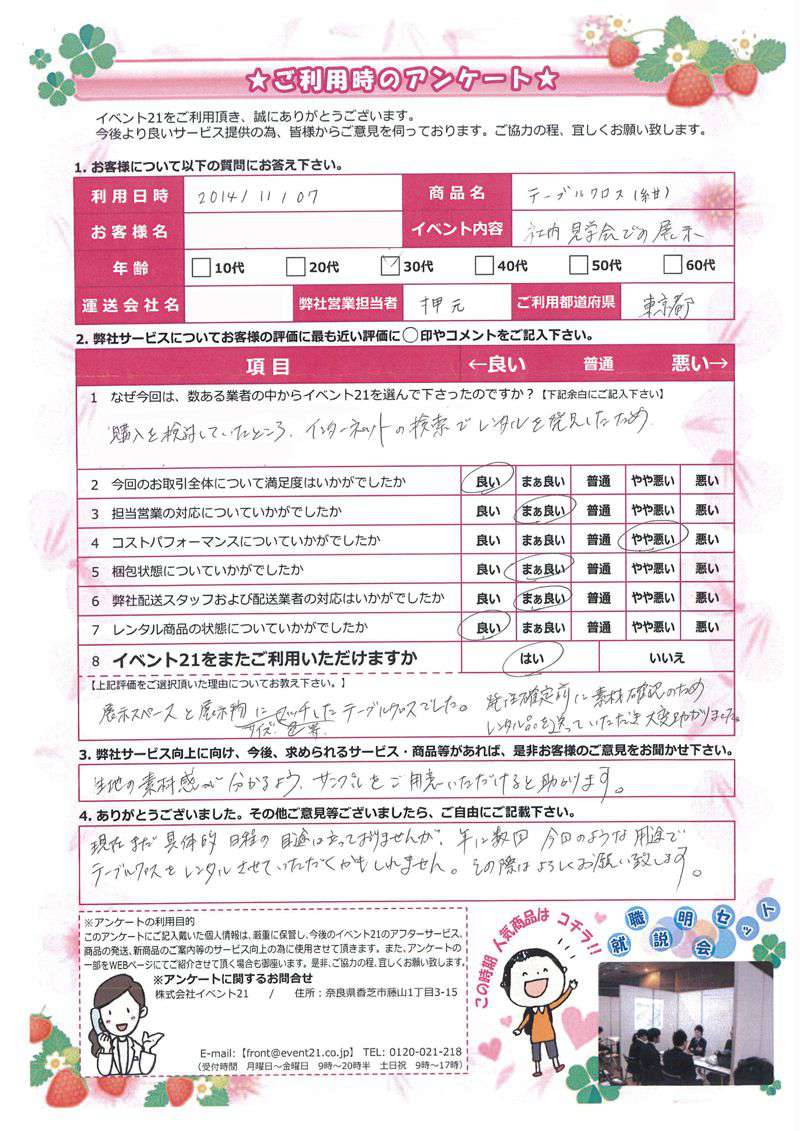 - 社内での見学会で精密機器を展示することになったため、展示用のテーブルクロスの購入を考えておりました。 インターネットでテーブルクロスについて検索中に、貴社のホームページを拝見し、写真のイメージが弊社の今回の使用用途に合っていたためレンタルを検討することになりました。