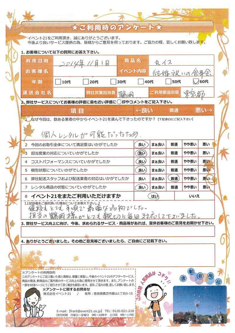 2014年11月にご利用いただいた60代、東京都のお客様より。