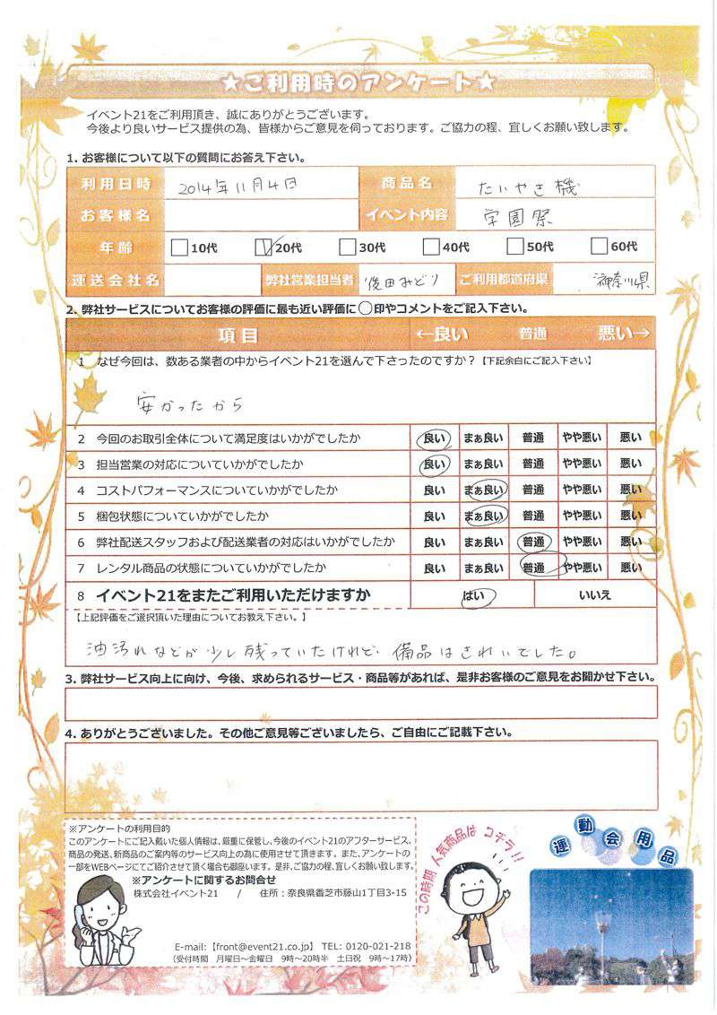 この度は弊社をご利用いただきましてありがとうございました!弊社は模擬店用の調理機材もお貸し出ししておりますので、次回ご利用の際、宜しければご相談下さいませ。