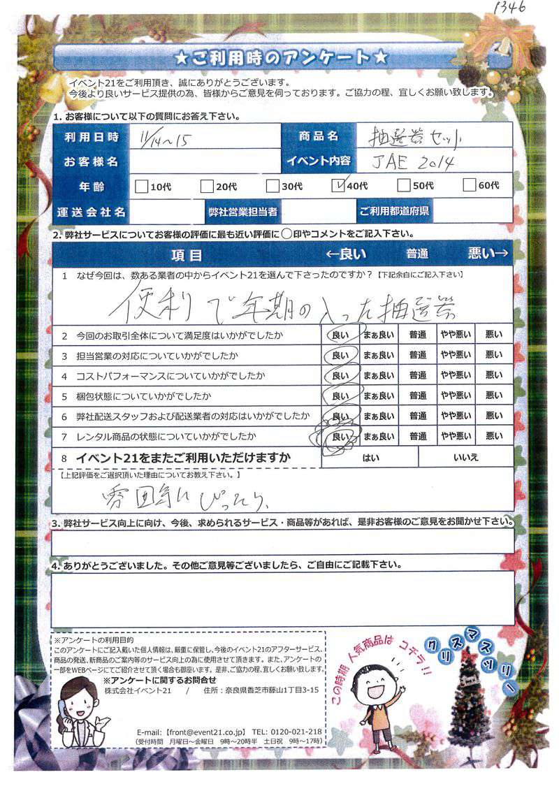 この度は弊社をご利用いただきまして、ありがとうございました。お客様のお役に立つことができ、大変光栄でございます。次回またイベント開催をお考えでしたら是非弊社へご相談くださいませ。今後ともどうぞよろしくお願い致します。