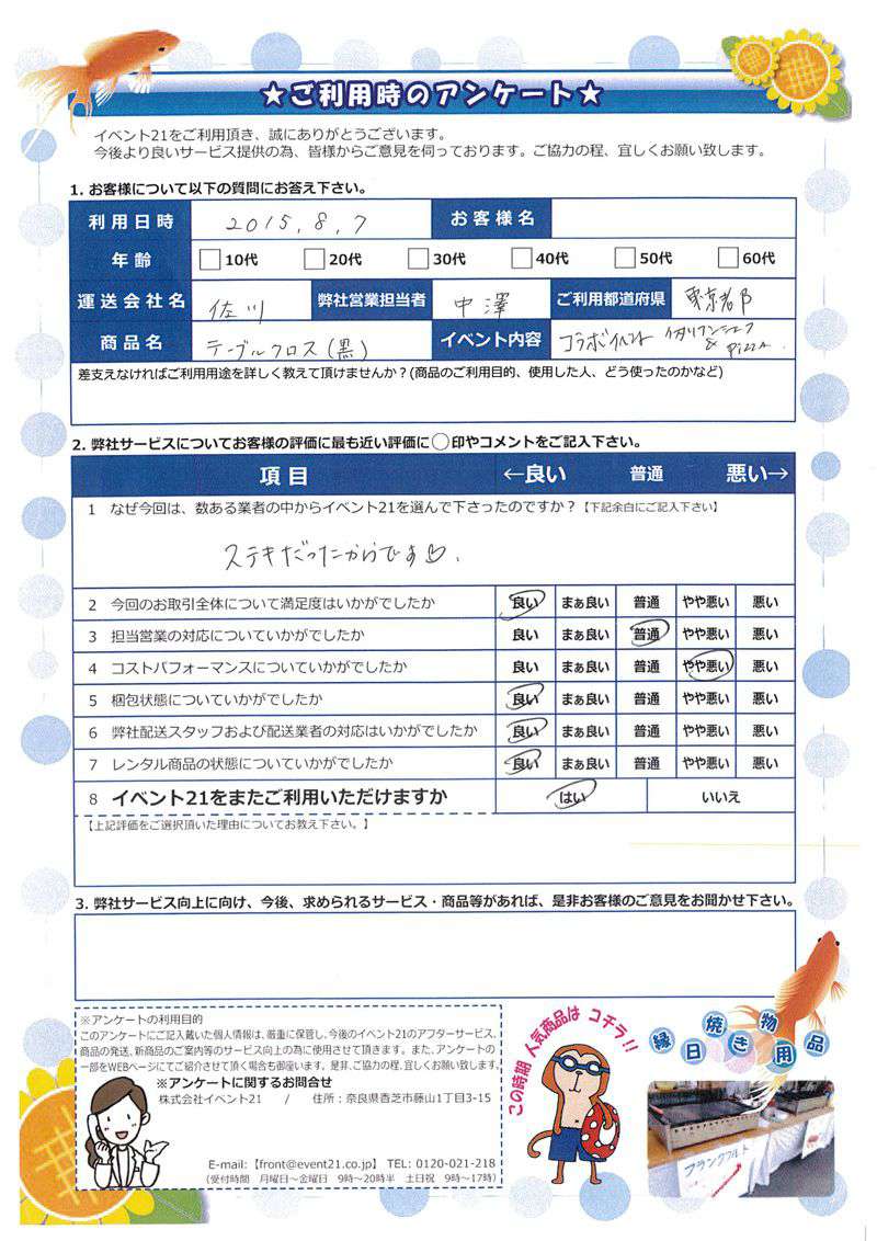 2015年8月にご利用いただいた30代、東京都のお客様より。