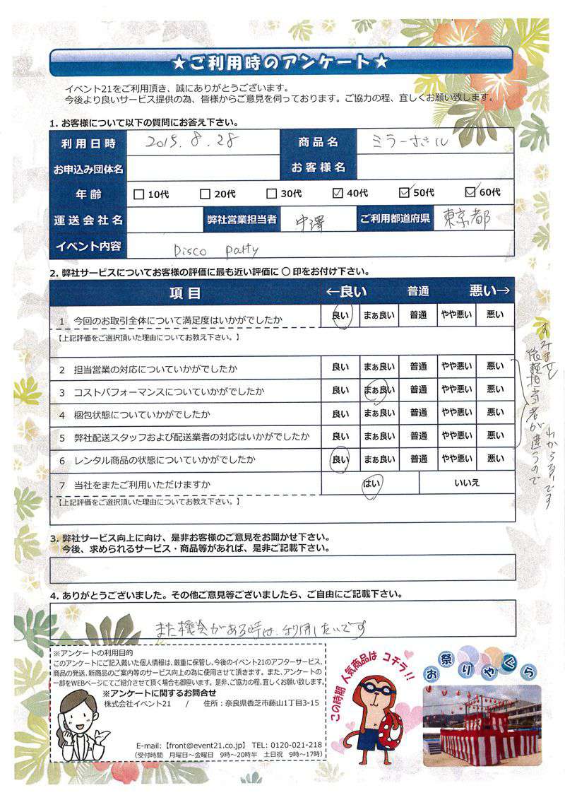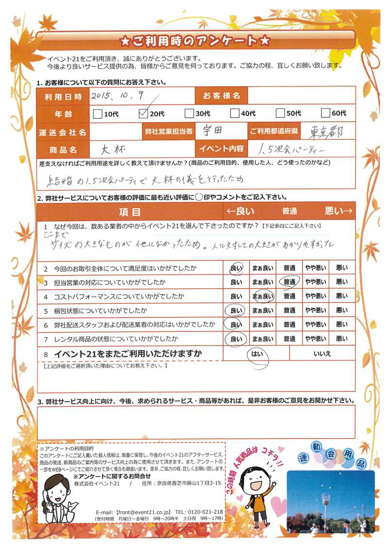 - 大変わかりやすく親切で丁寧でした。 こんなイベントはなかなかないと思いますが レンタルが必要な場合は、御借りしようと やりとりさせていただいたメールも印刷し ファイリングしていますので すぐに連絡ができるようにしています。 メールだけではなくお電話いただいたりと 本当に親切で大満足です。 福島様ありがとうございました。