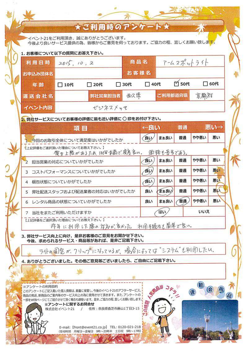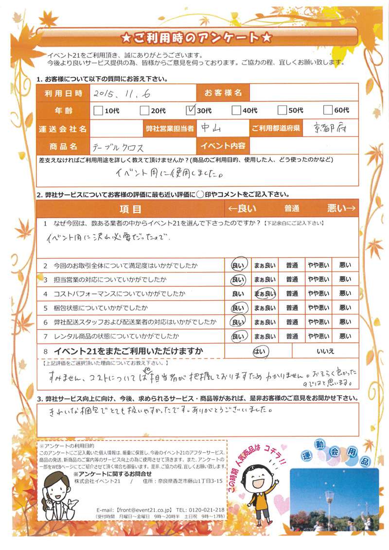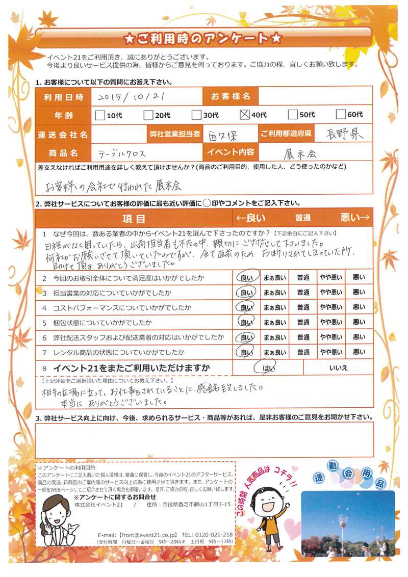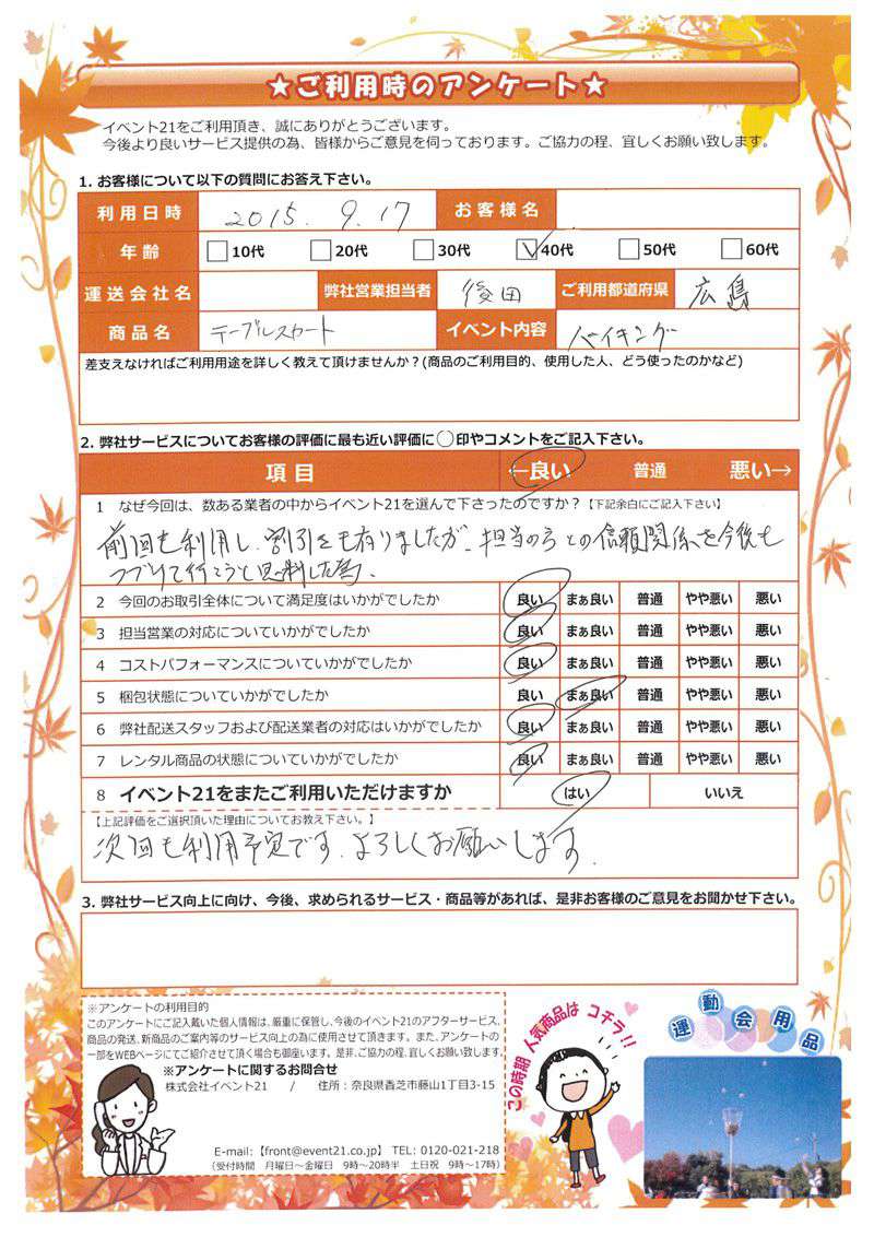 この度は弊社をご利用いただき、ありがとうございました。これからもお客様のイベントのサポートがしっかりできるよう努めて参ります。今後ともどうぞよろしくお願い致します。