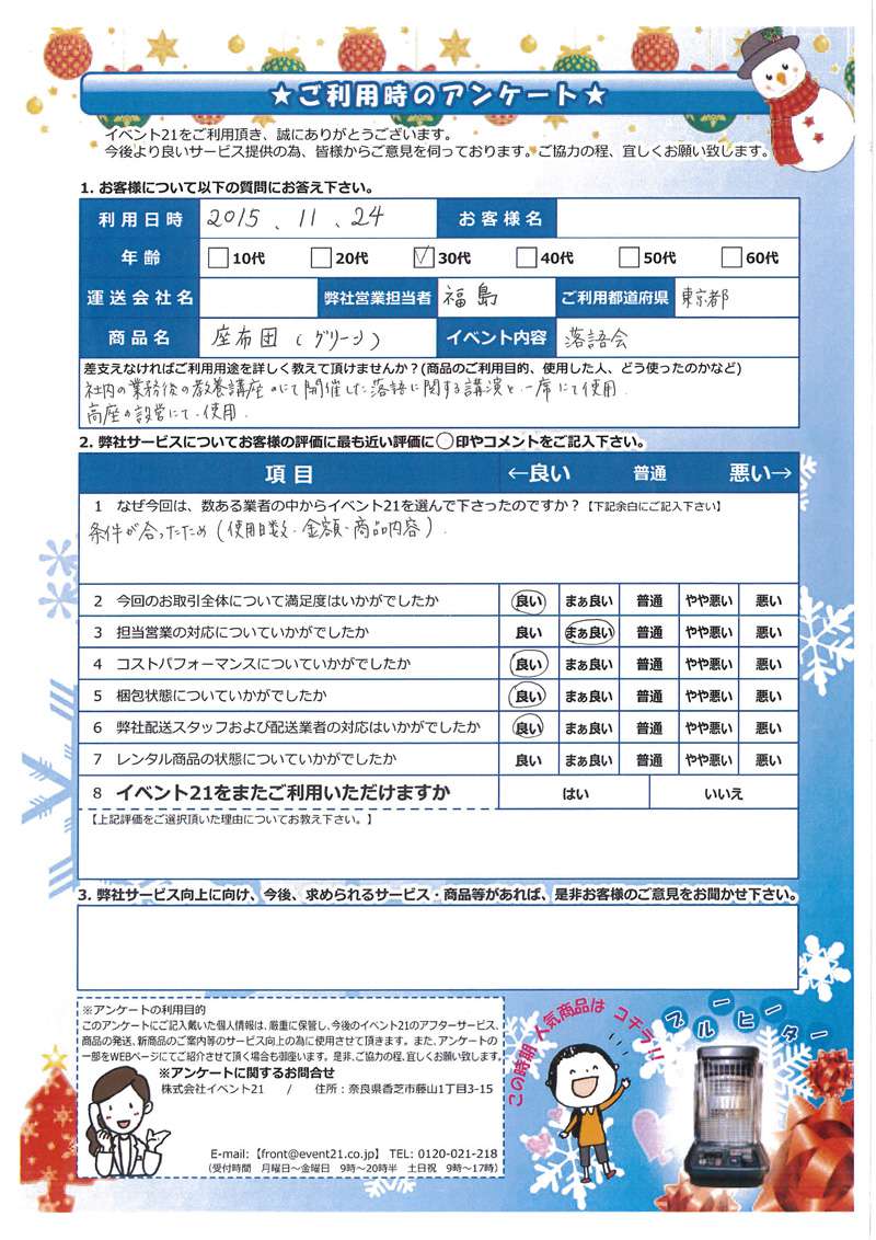 2015年11月にご利用いただいた20代、東京都のお客様より。