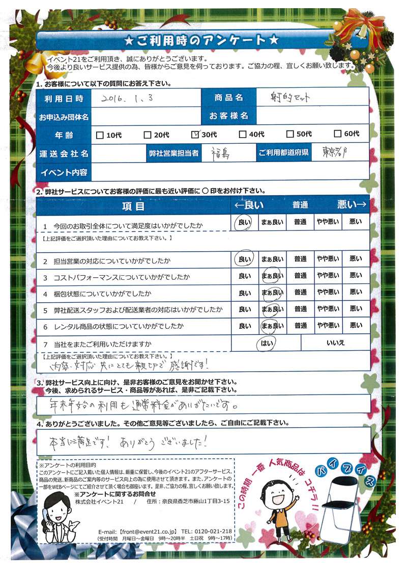 2016年1月にご利用いただいた40代、千葉県のお客様より。