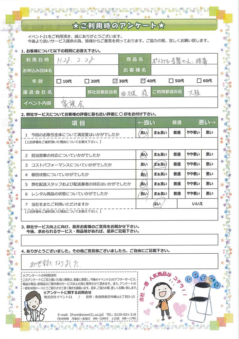 この度は弊社をご利用いただき、ありがとうございます。お客様にいつでも身近に感じていただけるようこれからもサポートして参ります。またイベント等ございましたら弊社にお問い合わせくださいませ。今後ともどうぞよろしくお願い致します。