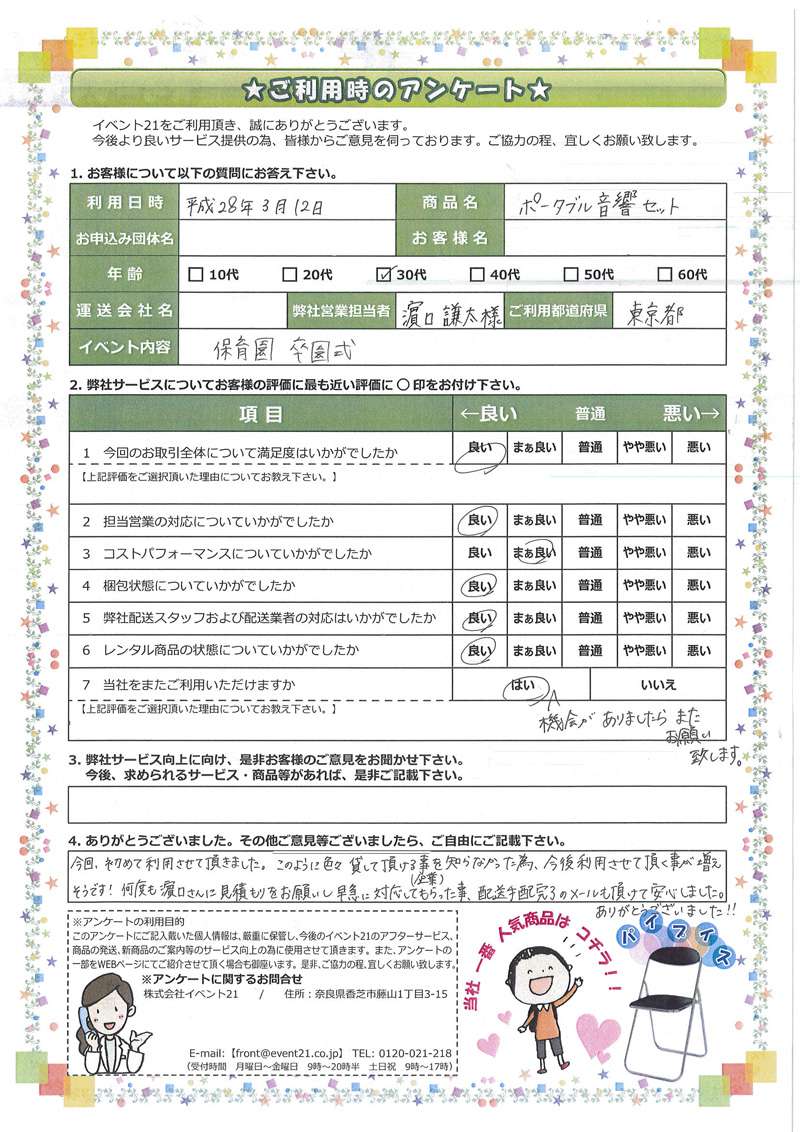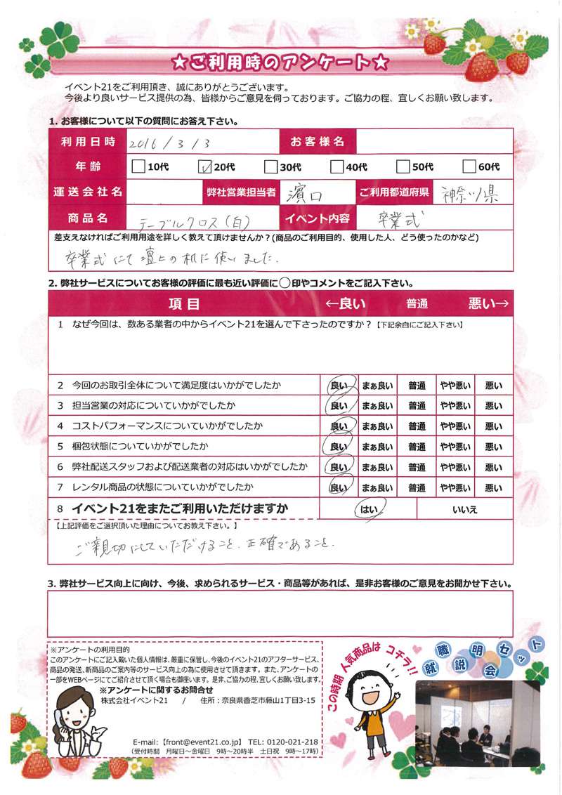 2016年3月にご利用いただいた20代、神奈川県のお客様より。