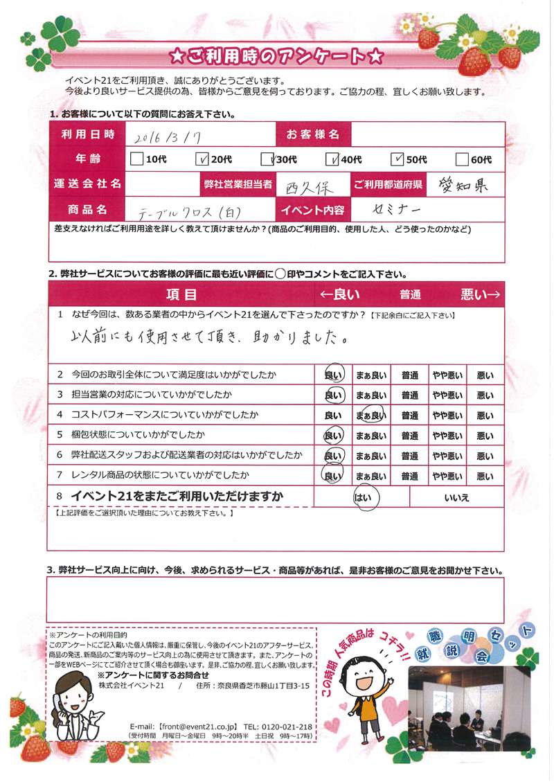 2016年3月にご利用いただいた20代、愛知県のお客様より。