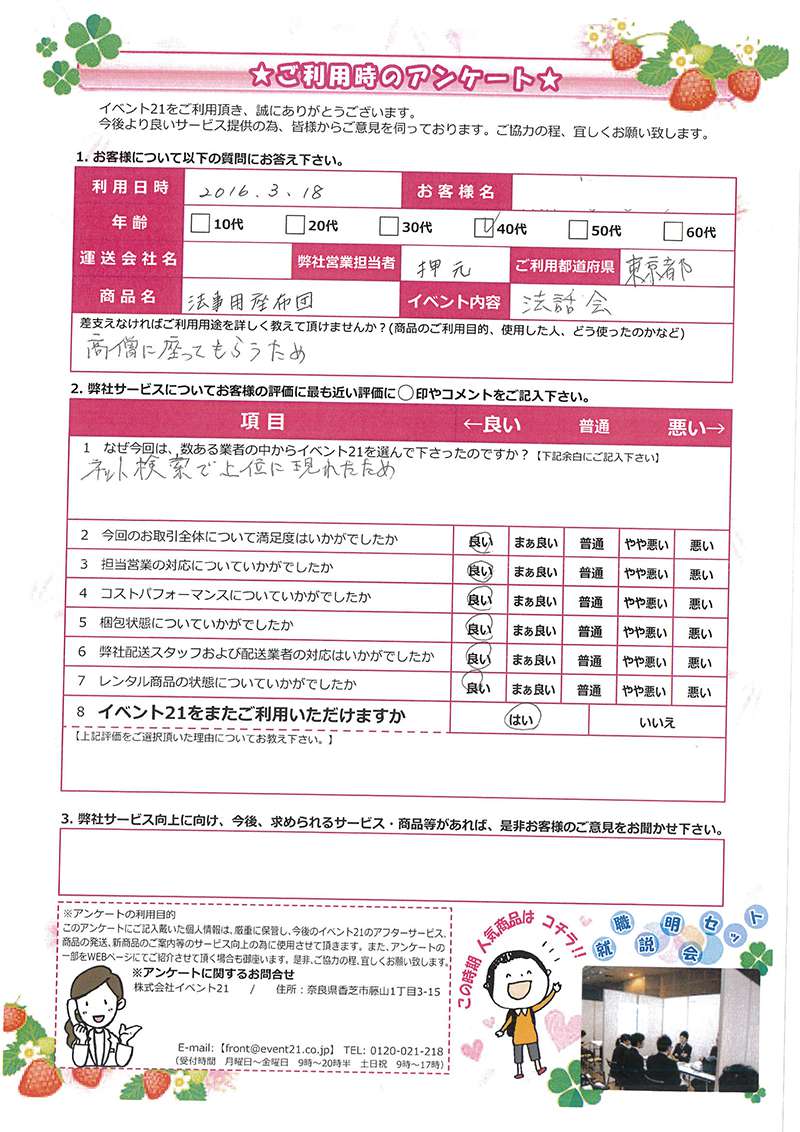 この度は就職合同説明会で弊社備品をご利用いただきまして誠にありがとうございます。 説明会やセミナーに役立つ物品も豊富に取り揃えておりますので、またご利用頂ますよう宜しくお願いいたします。