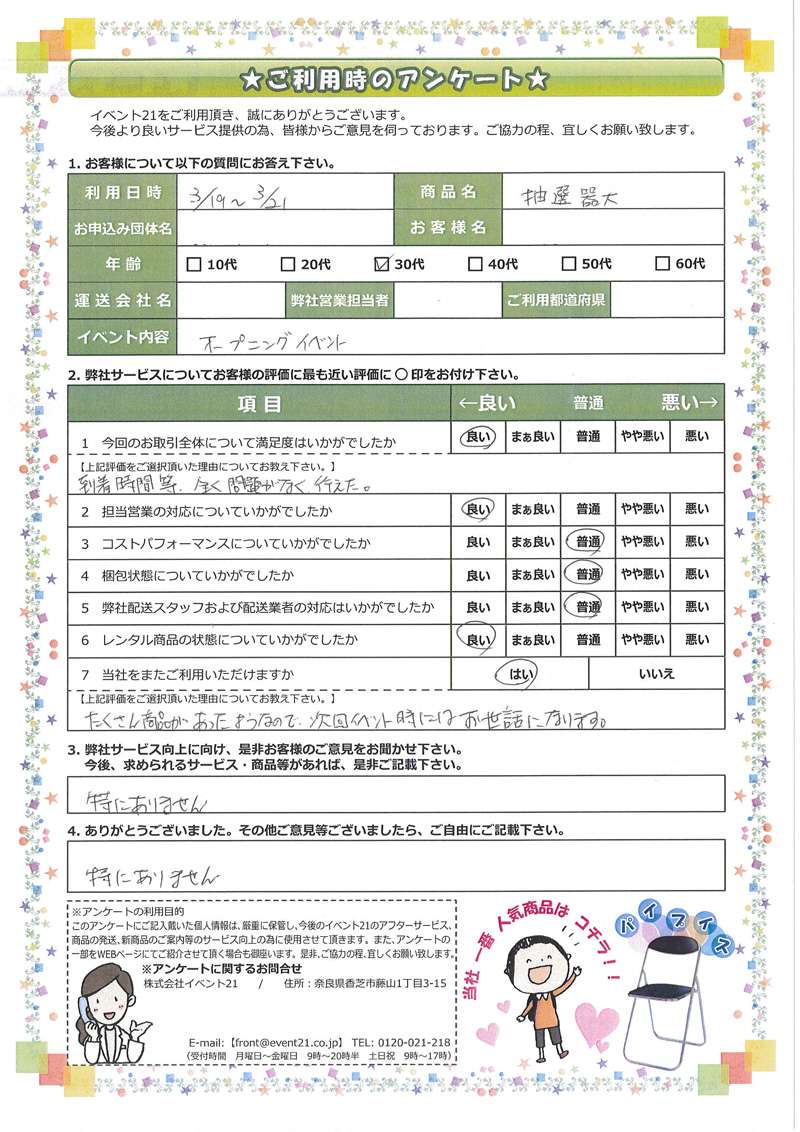 この度は折たたみステージのレンタルをご利用いただきまして誠にありがとうございました。ショッピングモールでのイベントは全国各地であると思いますのでたくさんの方にご利用いただきたいと思います。今後共宜しくお願い致します。