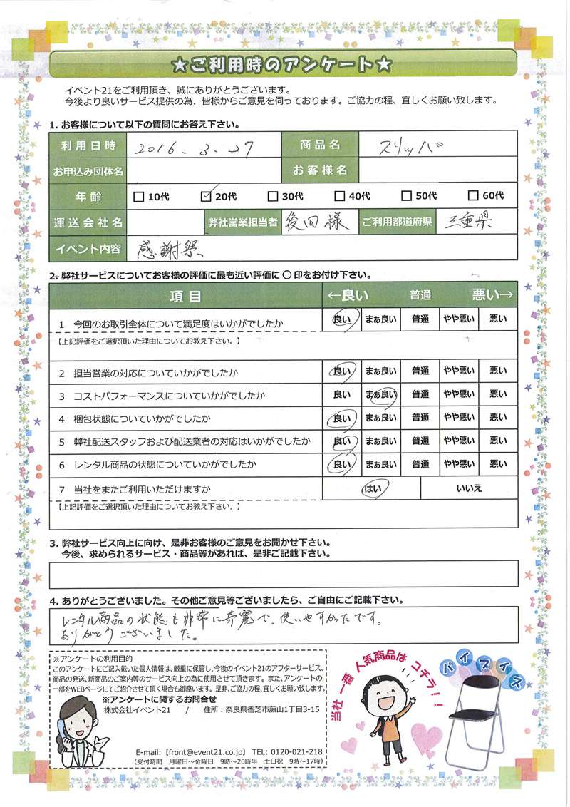 2016年3月にご利用いただいた20代、三重県のお客様より。