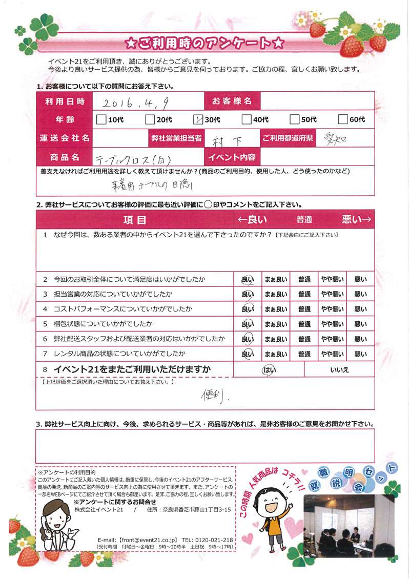この度は、弊社のテーブルクロス(白)をご利用いただき、誠にありがとうございます。 お客様のお求めに添う商品をお送りすることができ、私も嬉しく存じます。 次回も、ご利いただける際は更に良いサービスができるように頑張ります!