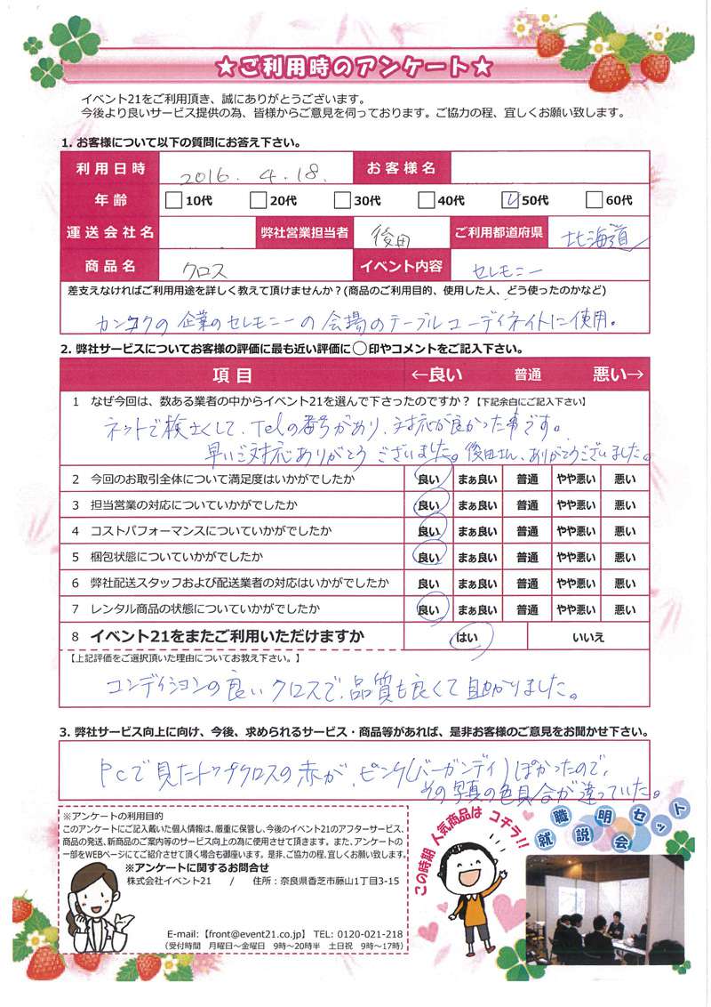 この度はテーブルクロスをご利用いただきまして誠にありがとうございました。 社交ダンスパーティーは成功されましたでしょうか? 次の機会も是非ご相談いただければ幸いでございます。 ありがとうございました!