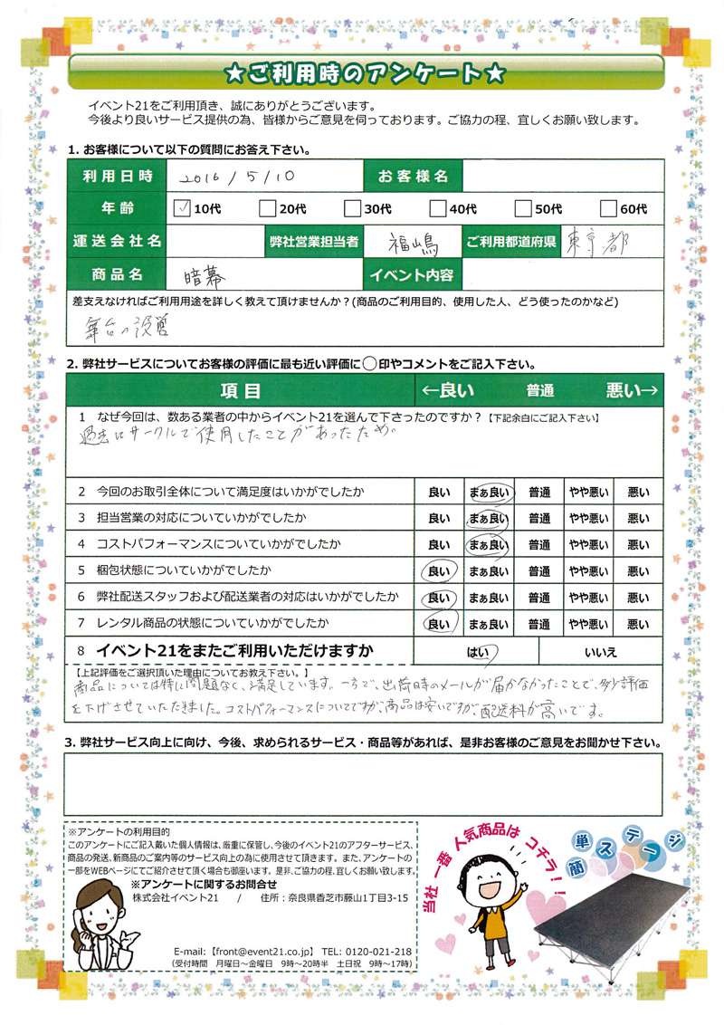 2016年5月にご利用いただいた20代、東京都のお客様より。
