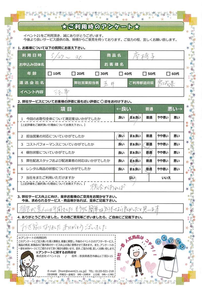 - 緊急のお願いにもかかわらず、迅速な対応をありがとうございました。当日、パイプ椅子を運んでくださった方がとても親切でびっくりしました。またよろしくお願いいたします。