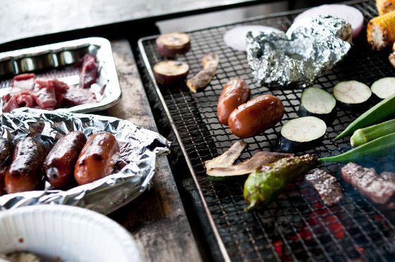 肉、ソーセージ、野菜も含めて焼いているBBQの様子です。