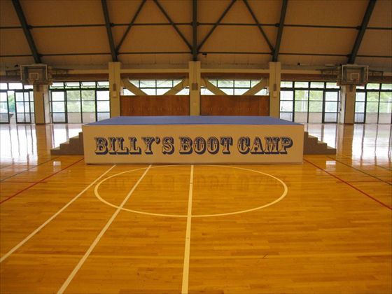 広い体育館に少し高さのあるステージを設営して、エクササイズを行いました。