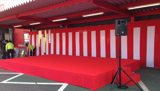屋外でショップイベントを行うために、紅白幕とステージを設営しました。