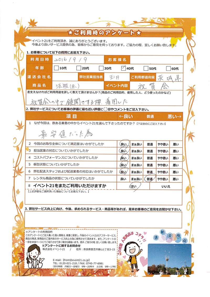 2016年9月にご利用いただいた40代、茨城県のお客様より。