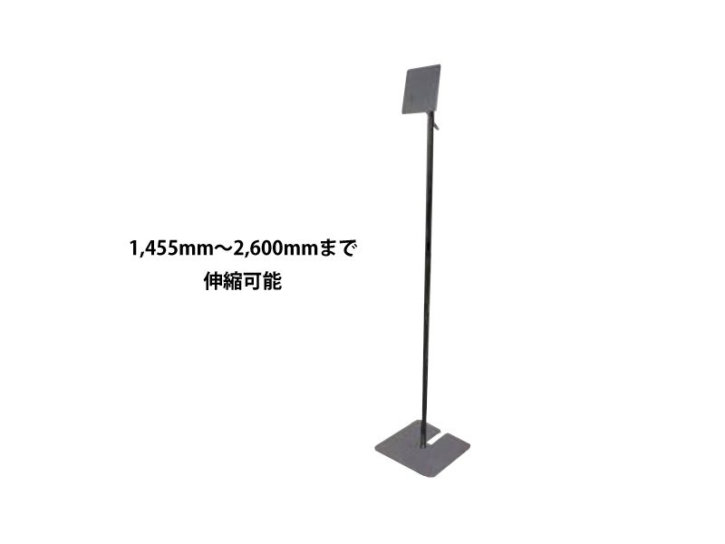 人がたくさん来場するイベントでは、案内を低い位置に設置してしまうと目につきにくかったり、そもそも見えないということがあります。こちらの商品は1,455mm〜2,600mmまで伸縮可能なので高い位置に案内を設置することができます。目立たないデザインなので会場の雰囲気を損なうこともありません。設置の際は、倒れないようにしっかり固定していただくようお願い致します。なお、パネルも併せて注文したいという方は、よろしければこちらもご覧下さい。