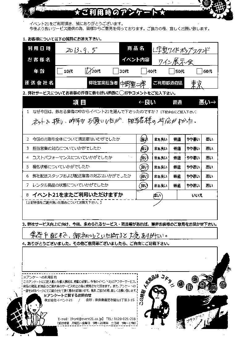 2013年9月にご利用頂いた20代東京都のお客様より