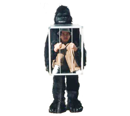 ゴリラに捕まって、さぁ大変!「檻の中の人質衣装」のご紹介です。一見すると、ゴリラ役と人質にとられた人間役の2名で構成されているようなこちらの商品、実は1人なんです!人間の顔と、ゴリラの足は本物、ゴリラの顔と人間の足はダミーとなって、このように見えちゃうんです!沢山の着ぐるみ衣装を取り扱っている弊社の中でも、かなりインパクトのある商品です!