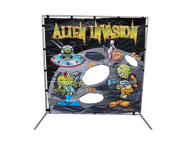 エイリアンの待つ惑星にロケットを発射!「エイリアン的当て」のご紹介です!こちらの商品は、ロケット型の弾を空気の力で発射し、的の500点、200点、100点とかかれた穴へ入れるというゲーム。点数が高い穴ほど小さく、難易度が高くなっています。また、ロケット型の弾はやわらかい素材でできていますので、キッズイベントでも安心してご利用いただけます。ご入用の際は、お気軽にお申し付けください。