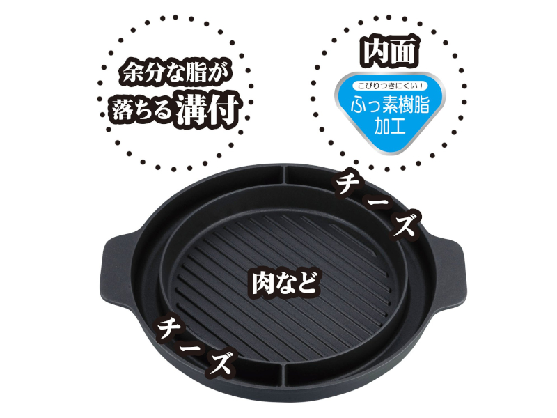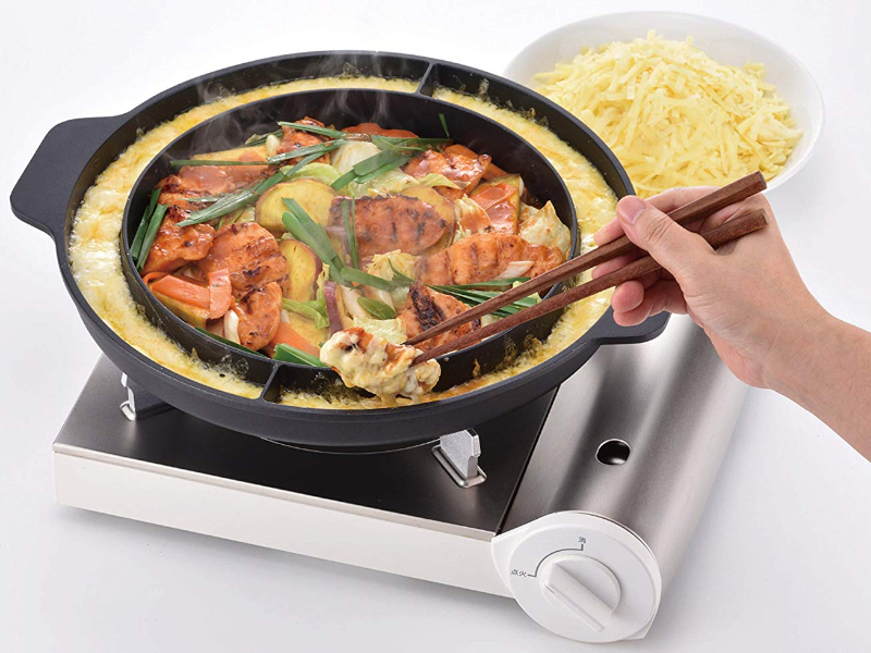 ご家庭で手軽にチーズダッカルビが楽しめる「チーズタッカルビ調理用鍋」のご利用はいかがでしょうか!日本で大人気の、韓国料理チーズダッカルビ。甘辛く炒めたお肉やお野菜を、とろ〜りと溶けたチーズを絡めていただきます。こちらの商品は、仕切られた中央部分でお肉などを焼き、外周部分でチーズを温め溶かします。焦げ付きやすいチーズもフッ素加工を施していますので、心配ご無用。忘年会や新年会、ファミリーパーティーなどで是非どうぞ!