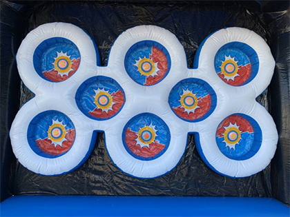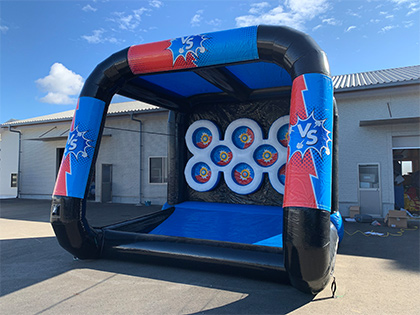対戦型のシューティングゲーム!「対戦型スポンジ弾」のご紹介です。こちらのゲームは、赤、青に分かれ、2人で得点を競います。的の中にあるボタンが赤・青・黄の3色にランダムに光り、自分の色と同じ色にヒットすれば加点、黄色は得点なし、相手の色をヒットさせてしまうと相手に加点されます。専用アプリを使用して、スタート、ストップの管理ができ、難しい事は何もありません。フェテェバルやお祭りに是非ご利用ください!