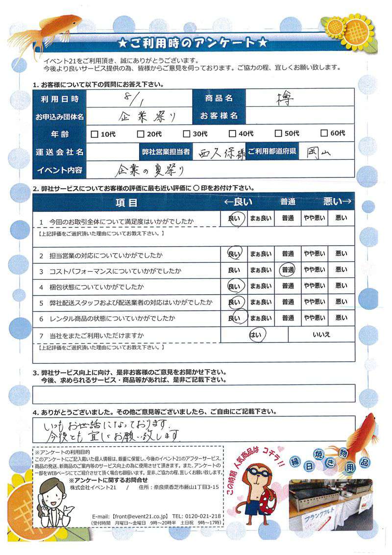 - 応対が迅速であり、今後のつながりと新たにイベントを行うときのレンタルが可能になると思ったためです。