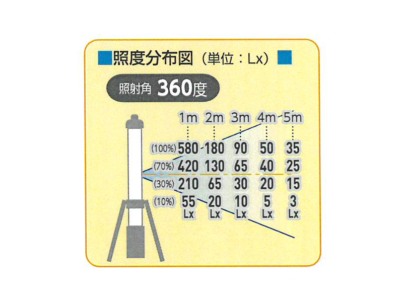 こちらの充電式LEDアップライトはその名の通り、充電式の照明です。ご自宅にある電源から4.5時間の充電していただきますと、約5時間〜55時間点灯します。点灯時間は明るさによって変わってくるので、用途に合わせて設定しましょう。明るさは100%・70%・30%・10%の4段階設定です。(※詳しくは画像の表にてご確認ください。) 360度照射で周りを明るく照らします。電源のない工事現場や倉庫、ガレージの他、ガーデンパーティーやキャンプなど様々なシーンで大活躍です!