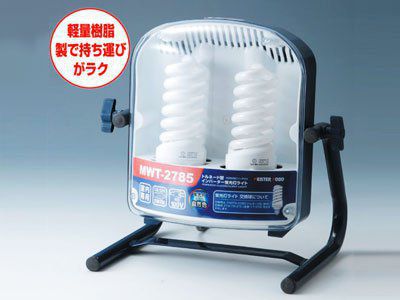 夜間の屋内工事に便利な工事用強力ライトのご紹介です!本体が樹脂製でとても軽く、必要な場所に簡単に設置できます。トルネード型小型蛍光灯を2個使用しているため、白熱球より明るく手元を照らします!
