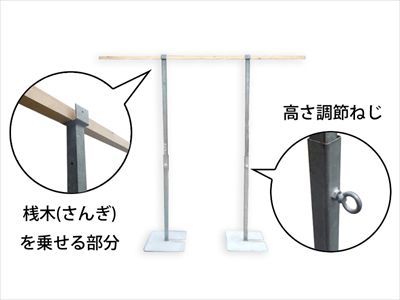 室内用の紅白幕自立式スタンドは高さ2,200mmの幕まで使用可能ですが、幕が擦ってしまうので上部で押しピンを止める時調整してください。 |
