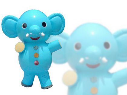 丸くてかわいい風船タイプのゾウ衣装 レンタルのご紹介です。中に人間が入っているようにはとても見えません。ふわふわのゾウは送風機を本体の中に入れて膨らませるタイプで、ブルーとピンクの2種類をご用意しました。ブルーとピンクを同時に揃えて、男の子ゾウと女の子ゾウをマスコットボーイとマスコットガールとしてに出演させるのもいいアイディアですよ。