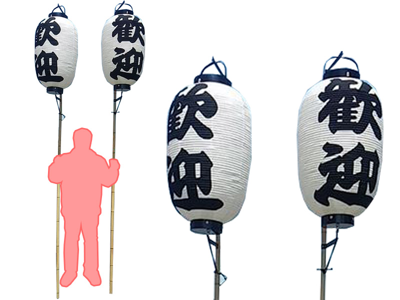 約2mの高さから、お客様の来場を喜んでいる気持ちをアピールできる、竿付き提灯のご紹介です!力強い字体で「歓迎」と書かれた提灯は、その高さから広い会場でもよく目立ち、アイキャッチとして最適です。会場の入り口などに立てて、アピールするのも素敵ですが、特徴を生かし、手に持って会場内を歩いて回ると、より多くのお客様に気持ちが伝わるかもしれませんね!PRイベント、お客様感謝デーなどにいかがでしょうか?