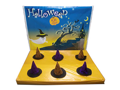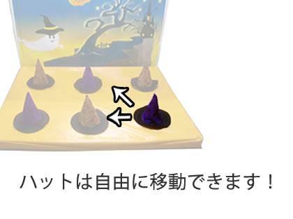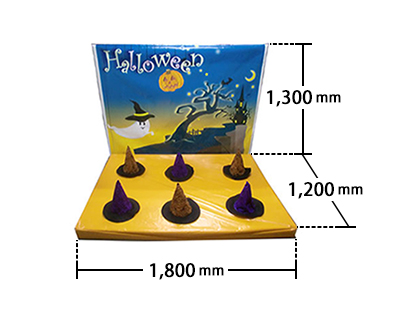魔女のとんがり帽子に輪っかを入れる輪投げゲーム『魔女帽子輪投げ』です!ジャックオーランタンやお化けのイラストが描かれているので、ハロウィンイベントなどにぴったりの輪投げゲームです!的となる魔女の帽子もデザインが可愛く、子供達に人気の商品です!とんがり帽子は位置を変えることができるので、お客様に近いところに移動したり、帽子を一か所に集めたりしてレイアウトをお楽しみください。