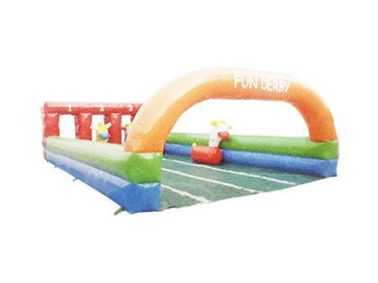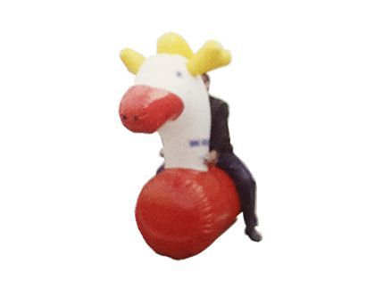 送風機を使って馬型のバルーンを膨らませ、その馬にまたがって競争するゲームのご紹介です。馬型バルーンにまたがって、前へジャンプしながら進みます。小さなお子様はもちろんのこと、大人も童心に返って競争できます。空気で膨らんだ馬ですので、実際の生きている馬と違い、安全に遊べます。運動会や自治体のイベントでも活躍します。