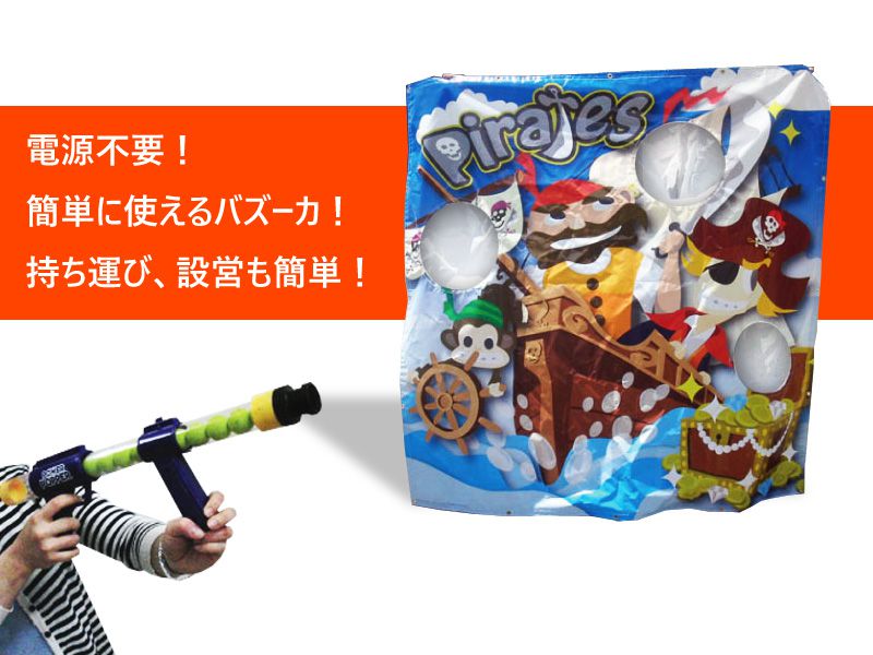 電源不要のバズーカ砲ゲームの登場です!簡易式のバズーカ砲に柔らかいボールをセット、海賊の絵が描かれたバックパネルにある3つの穴をねらって発射!特に決まったルールはありませんので「同じ穴に連続で入れると高得点!」や「すべての穴に入れると得点が3倍!」など、会場でルールのアレンジをして楽しむことができます。構造はシンプルですので、設営も15分ほどで完了します。屋内外問わずお楽しみいただけます!