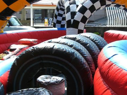まるでレース会場に来たかのようなサーキットふわふわのご紹介です。送風機でタイヤや車を膨らませて、キッズ専用のサーキット会場のでき上がりです。タイヤも、道路の部分もすべて空気でふわふわなので、跳んだりはねたり、くぐったり、思う存分遊べる楽しいコーナーとなります。車やバイクの展示会や、サーキットショーに来場したお子様向けのコーナーとしてご活用ください。