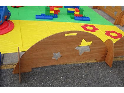 小さなお子様たちが遊ぶキッズスペースのまわりを囲む、キッズフェンスです。ゆるやかな山上の板が連なり、星形や三角に切り抜かれたフェンスは安全かつ可愛らしいデザインです。子供たちがキッズスペースから出ていってケガなどをしないよう安全のためにキッズフェンスをご利用ください。