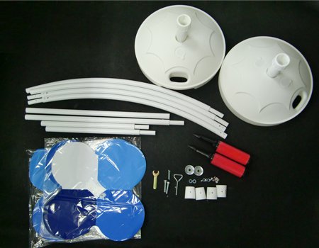 固定台は一般市販のパラソル用のものを使用していますので、支柱の部品が入っていますがこのキットには不要です。また固定台のケースに印刷されている組み立て図も無視してください。