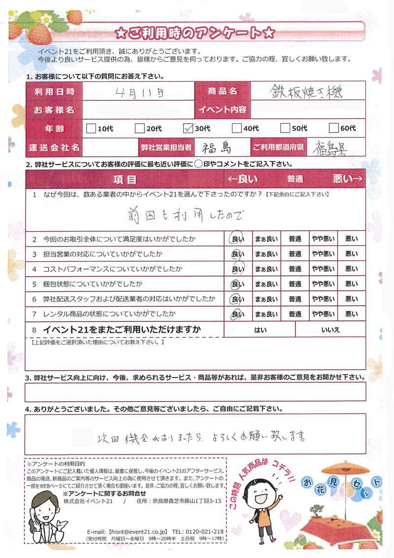 2015年4月にご利用いただいた30代、福島県のお客様より。